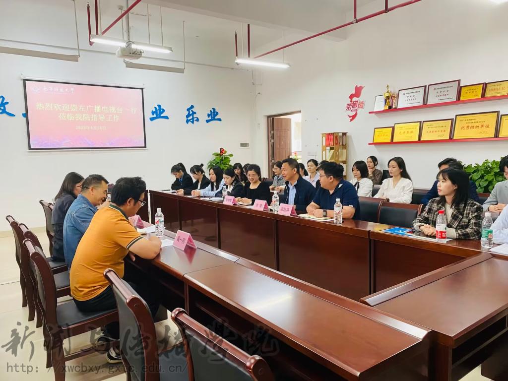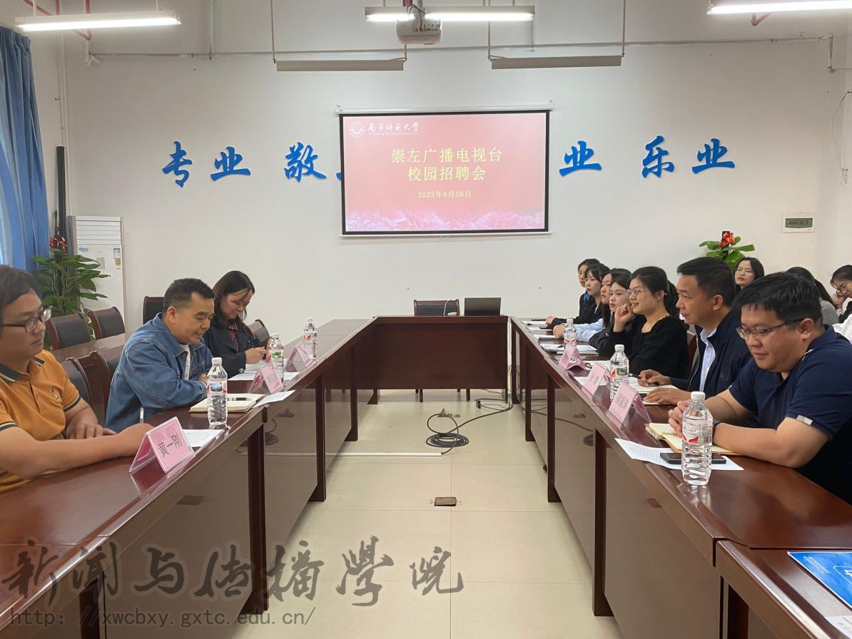 4月26日上午,崇左广播电视台校园招聘会暨2023届毕业生就业双向洽谈会在我校五合校区理综楼304举行。崇左市广播电视台台长助理、新闻中心主任黄绍康,融媒体中心主任陆薇薇,融媒体中心副主任黄一刚一行三人来我院洽谈毕业生就业工作,学院党委副书记、院长徐健,副院长梁颖涛,辅导员陈丽珍以及部分学生代表参加此次就业洽谈会。